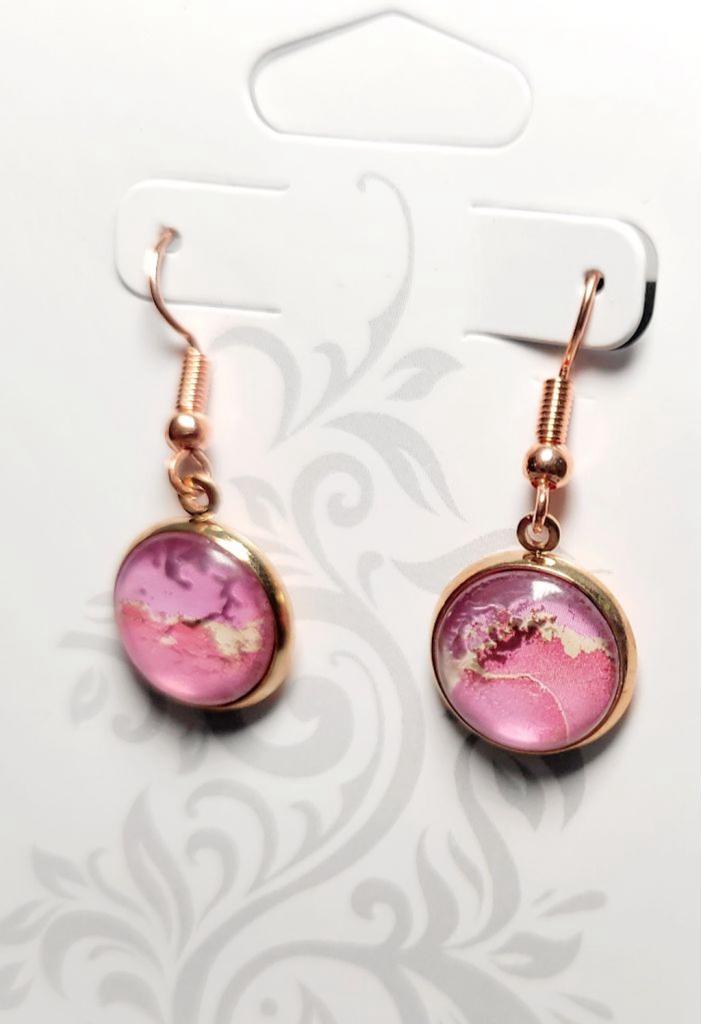 Hand crafted artisan dangle drop earrings with a pink and gold marble effect on a rose gold colored earring beveled tray . Measures 1".
