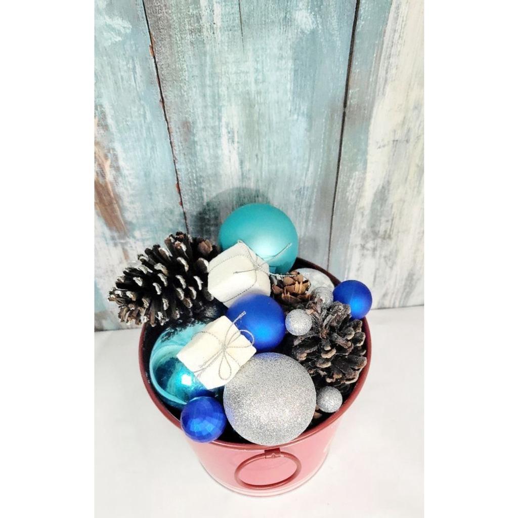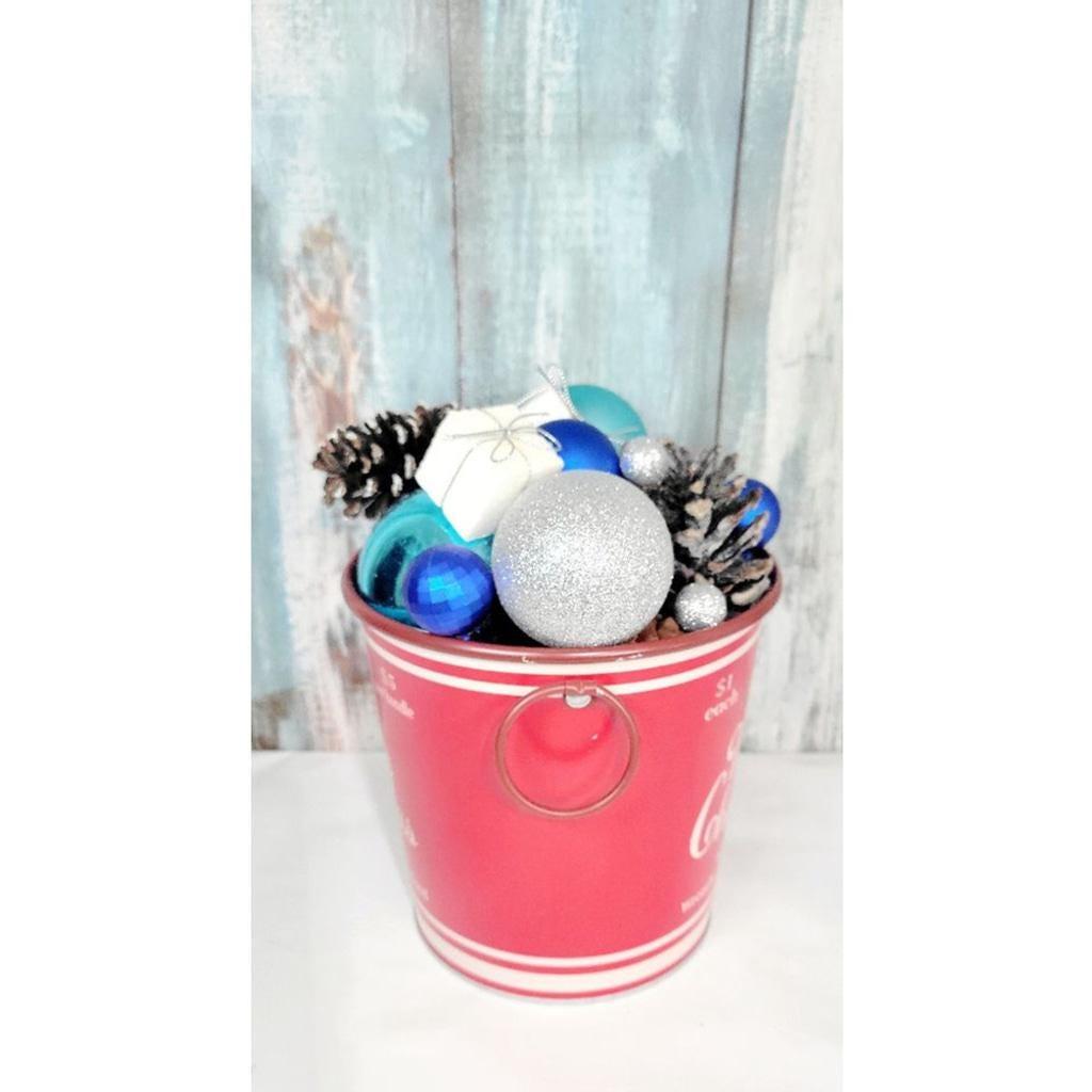 This is a new, unused Ashland Christmas decorative container. It is a red metal bucket with a white rim. The bucket is approximately 6 inches tall and 5 inches in diameter. It features a printed design that says "Merry Christmas" and "Hand Picked Wreaths - Mistletoes - Garland." The bucket is handcrafted with various blue and silver shatterproof Christmas ornaments and white presents, as well as pine cones. The bucket is in perfect condition and comes with its original tags. It would make a perfect table centerpiece during the holiday season
