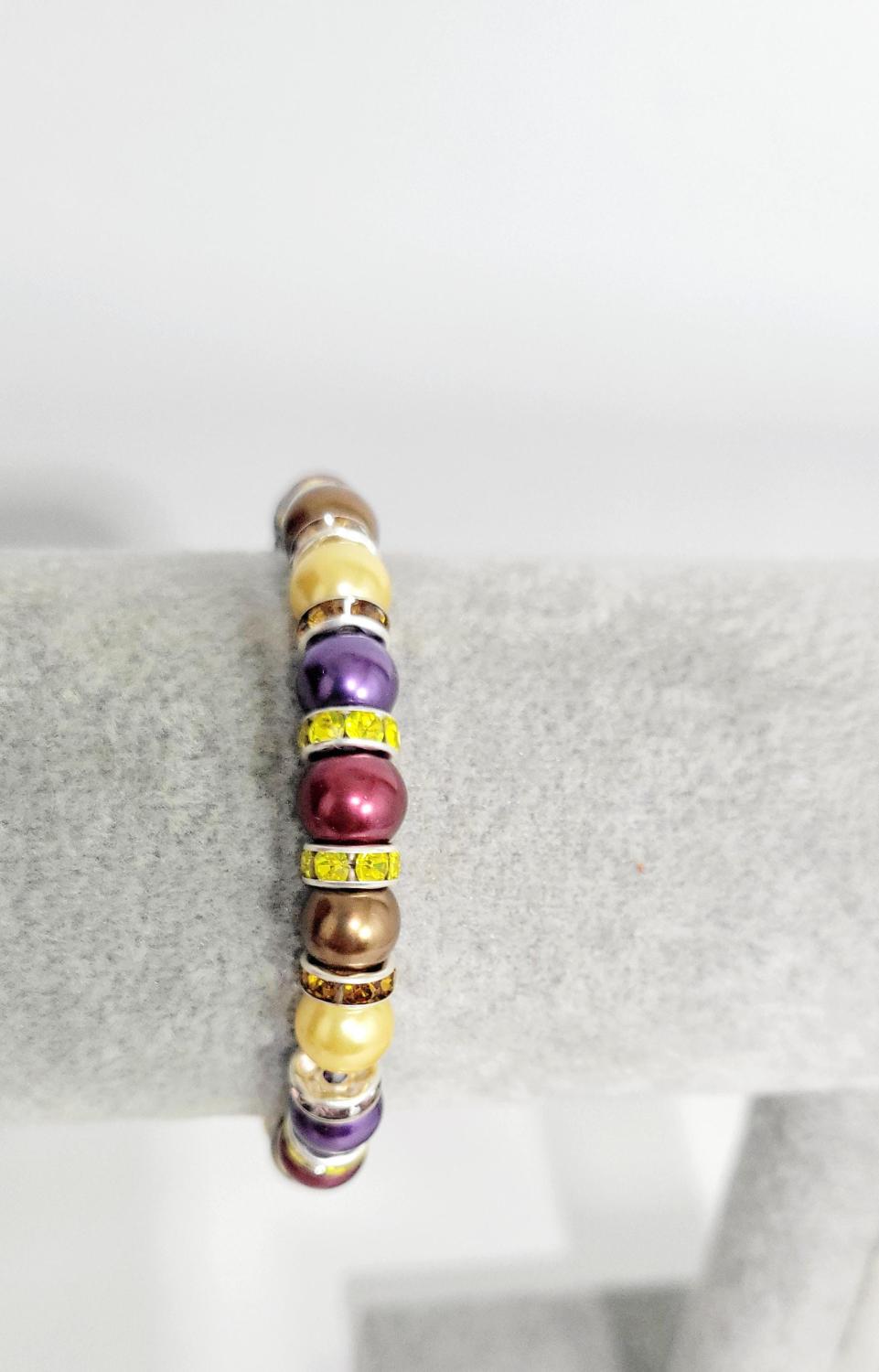 Hand crafted Autumn Fall themed bracelet, in red, purple, brown, and gold glass beads, 1 large main red bead, with brown and yellow rhinestone spacers, pumpkin and leaf charms hanging from charm holders, on a stretchy cord. Measurements are approximately 7-7.5".