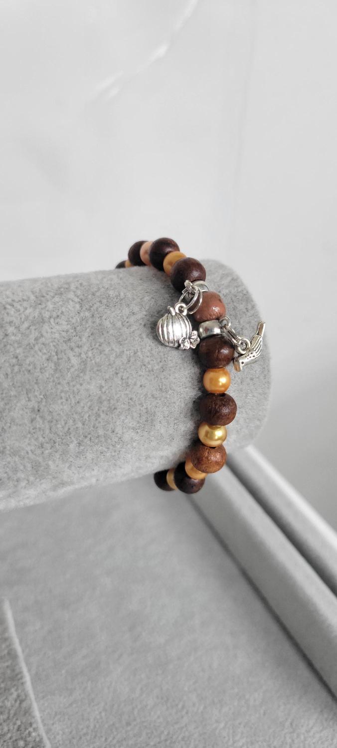 Hand crafted golden & peach colored glass beads, wood beads, with a pumpkin and bird charm hanging on charm holders, strung on a stretchy cord. Measurements are approximately 7".