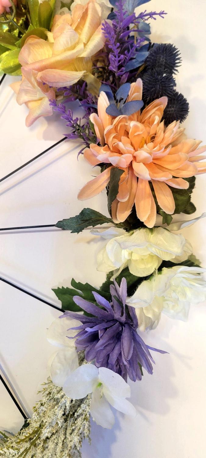 Handmade 14-inch bicycle wheel wreath decorated with artificial flowers of roses, peonies, sprigs, berries, greenery, and more, hung from a twine rope. All purchases are wrapped with care and a handwritten thank you card included. Gift wrapping is available upon request. #Wreath #FarmhouseDecor #WallDecor #BicycleDecor