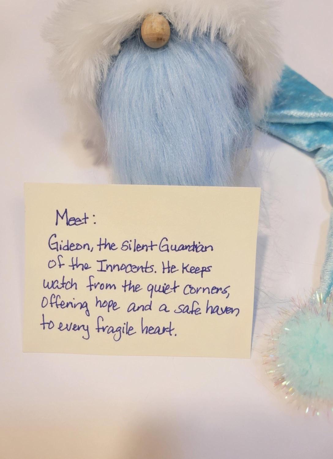 Meet Gideon, the Silent Protector of The Innocents. He is more than a gonk/gnome—he's a quiet beacon of hope and a safe haven for every fragile heart. Watching silently from his quiet corner, Gideon offers comfort and a gentle reminder that better days are coming. ​ Gideon was created with a profound purpose: to be a gentle advocate against child abuse and a symbol of light amidst the darkness of fear. Our lives have been personally touched by this struggle, and we hope Gideon will help any child, survivor, or advocate feel a renewed sense of safety and peace. ​ The Details: ​ Materials: Crafted from a soft blue and white striped sock, a long, plush velvet hat, a blue faux fur beard, and topped with a sparkling pom pom. ​Weighted for Comfort: Stuffed with rice and poly-fil, he has a satisfying weight for stability and grounding comfort. ​ Size: Approximately 8" tall (21" to the tip of his hat). ​ A Gift with Purpose: ​This is the perfect, meaningful gift for child abuse survivors, social workers, teachers, nurses, and counselors. ​10% of all proceeds will be donated to the National Child Traumatic Stress Network (NCTSN) to support children who have experienced trauma.