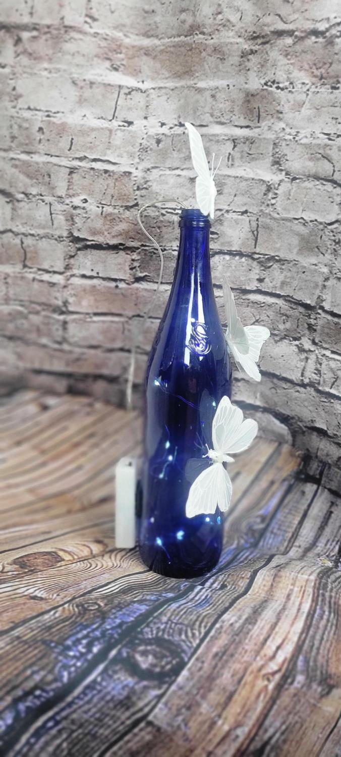 A gorgeous cobalt blue wine bottle repurposed into a table centerpiece for home, a wedding table, or as simple as your night stand or end table. 3 white butterfly appliques have been added, along with a string of LED fairy lights, which the box is conveniently velcroed onto the back, making it easy to turn on and off, and replace the 2x AA batteries when needed. I'm able to gift wrap this and include a gift receipt prior to shipping, please just message me if you need this done.