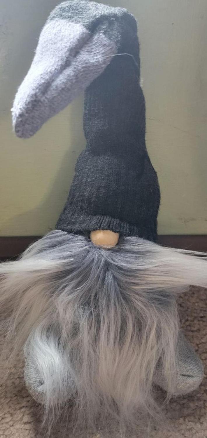 Handcrafted with love, meet Thistle Knobturner, the doorstopper gonk gnome that's weighted and sturdy, yet adorable. Thistle has a flowing Mongolian beard and mustache, wooden nose, and a gray and black (Puma) outfit. He stands approximately 14.5" tall to the tip of his hat.