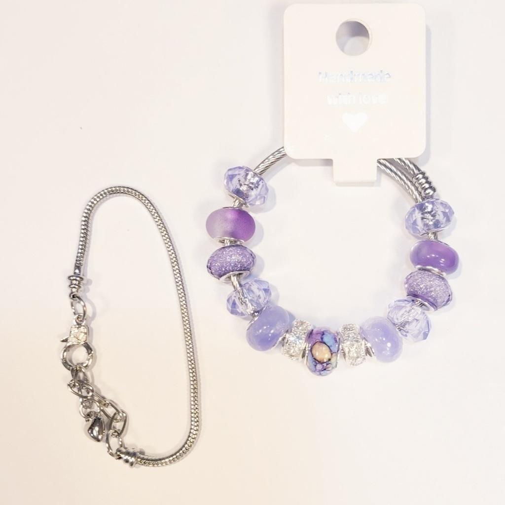 Handmade beaded 7" adjustable snake coil bracelet. The beads are made from brass, resin, and glass. The bracelet also comes with a second snake coil chain, with a 2" adjustable clasp and a heart charm. Simply twist the end off to customize your bracelet at home. This elegant charm bracelet features a stunning combination of purple hues, perfect for adding a touch of sophistication to any outfit. The intricate design and vibrant colors make it a must-have accessory. #Europeanstylebeads #beadedbracelet #snakecoilbracelets