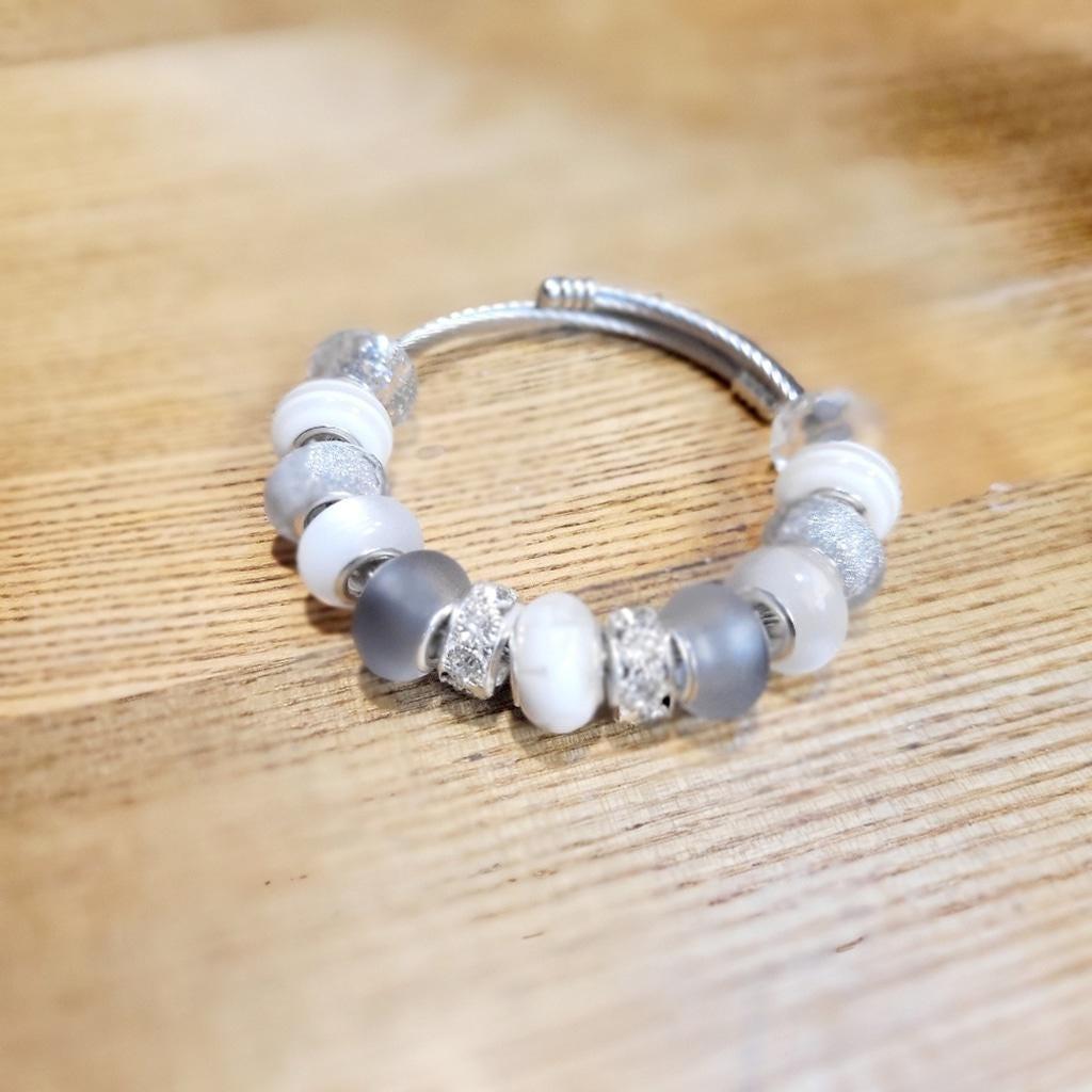 This elegant artisanal bracelet features a stunning combination of large hole silver and white beads, on an expandable 7" snake coil silver bracelet, perfect for any occasion. Its sophisticated design adds a touch of class to your outfit. The beads are made from brass, resin, and glass.