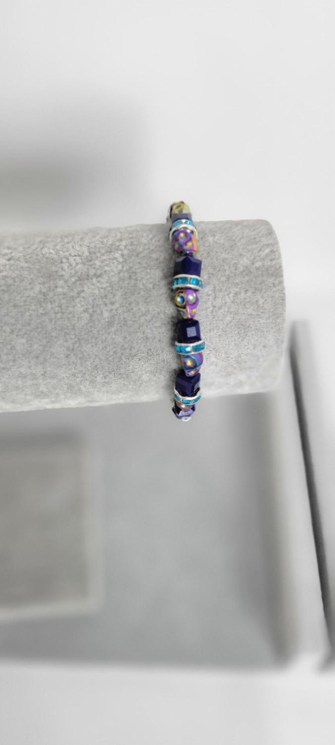 Hand crafted bracelet with iridescent skulls, dark blue glass beads, and blue rhinestone spacers, with a stretchy cord. Measurements are approximately 7".