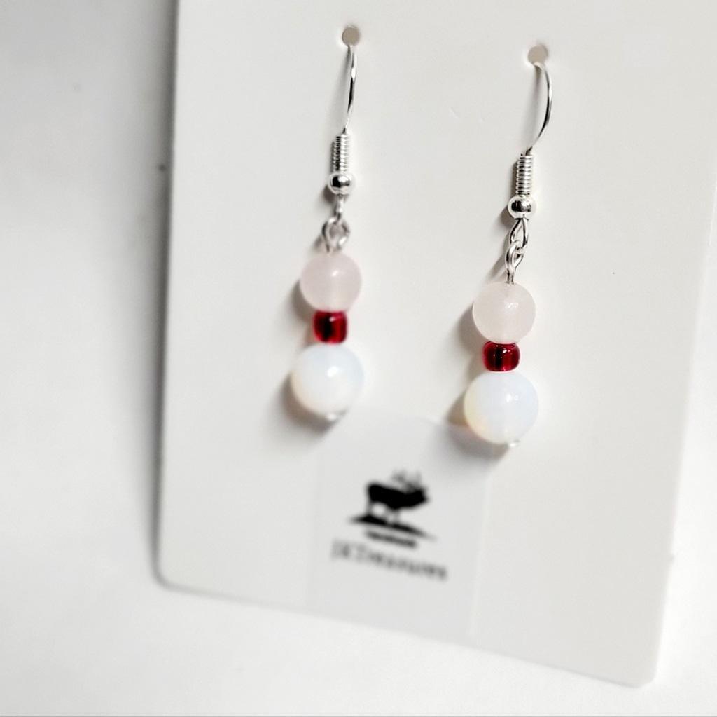 Hand crafted 7 mm rose quartz and Moonstone crystal beads with a red glass seed bead spacer on a wire hook. Measures approximately 1".