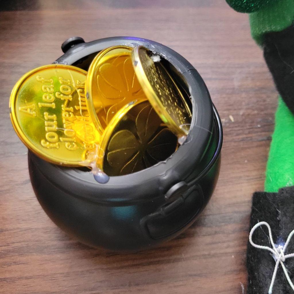 Hand crafted St Patrick's Day Leprechaun gnome made from a black with lucky green 4 leaf clovers, weighted with rice, brown button nose, long, gray, flowing beard, with matching hat, topped off with a green pom pom. He measures approximately 7" tall.