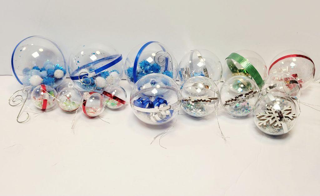 Handmade decorative clear ball Christmas ornaments made with blue and white pom poms, faux snow, different colored ribbons, and Christmas inclusions, which includes candy canes, candy, trees, snowmen, stockings, glitter, and more. Each ornament is sealed and wrapped with ribbon. The 3x 3" ornaments have spiraled silver hooks, and the 4x 2.5, 4x 2, & 4x 1" have silver threads.