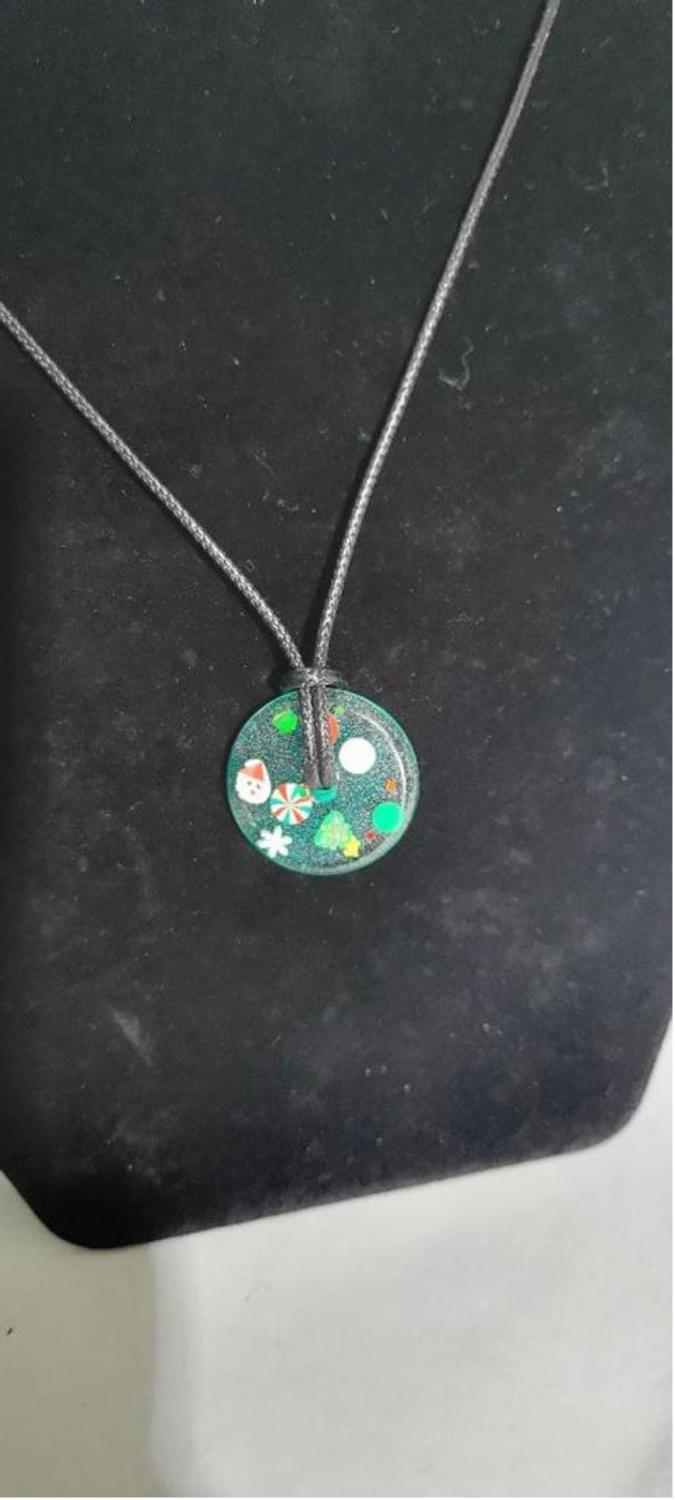 Handmade Christmas themed medallion necklace with a round, green, resin pendant. The pendant is approximately 3/4 inch in diameter and features various Christmas-themed embellishments, including snowflakes, candy canes, and Christmas trees. The pendant is attached to a black, adjustable cord necklace with a silver-toned lobster clasp. The necklace is approximately 14 inches in length.