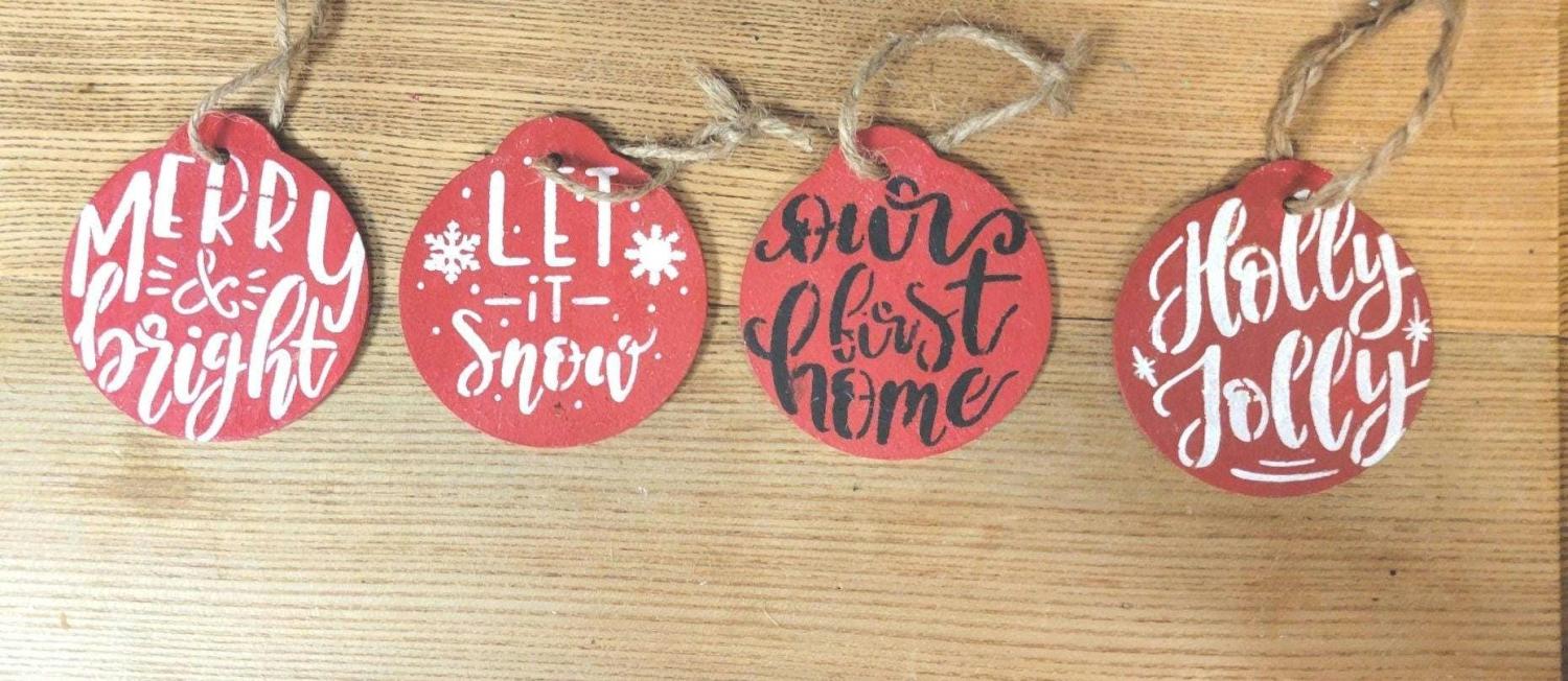Handpainted 3" wood disc ornaments of your choice of color paint, saying, and twine or ribbon to hang from. Please inquire as to availability.