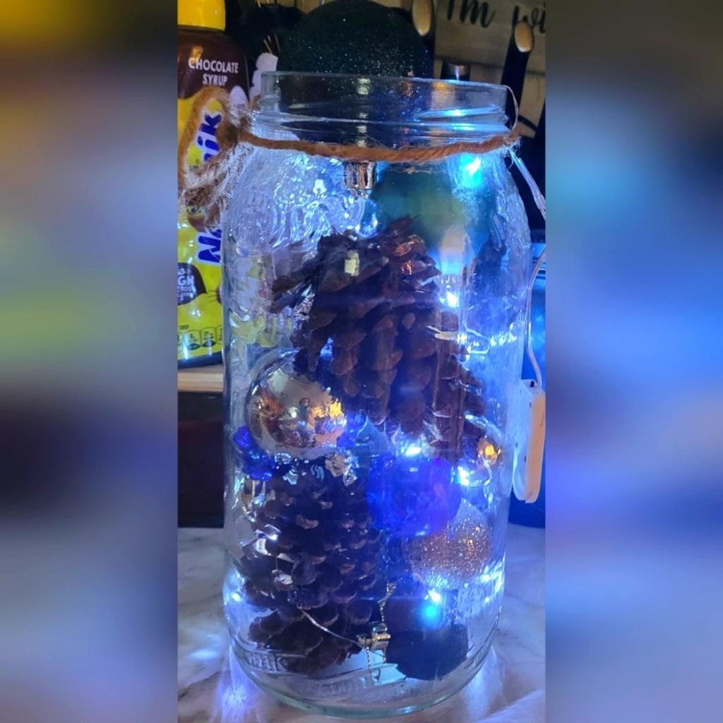 Handmade tall glass jar filled with blue, teal, and silver ball ornaments, scented pine cones, and white fairy lights, and tied with a wired twine rope.