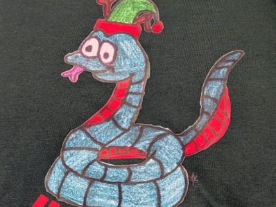 This exclusive design features my original art of an elf snake or snake around a tree. Our logo is featured on the back of the shirt.