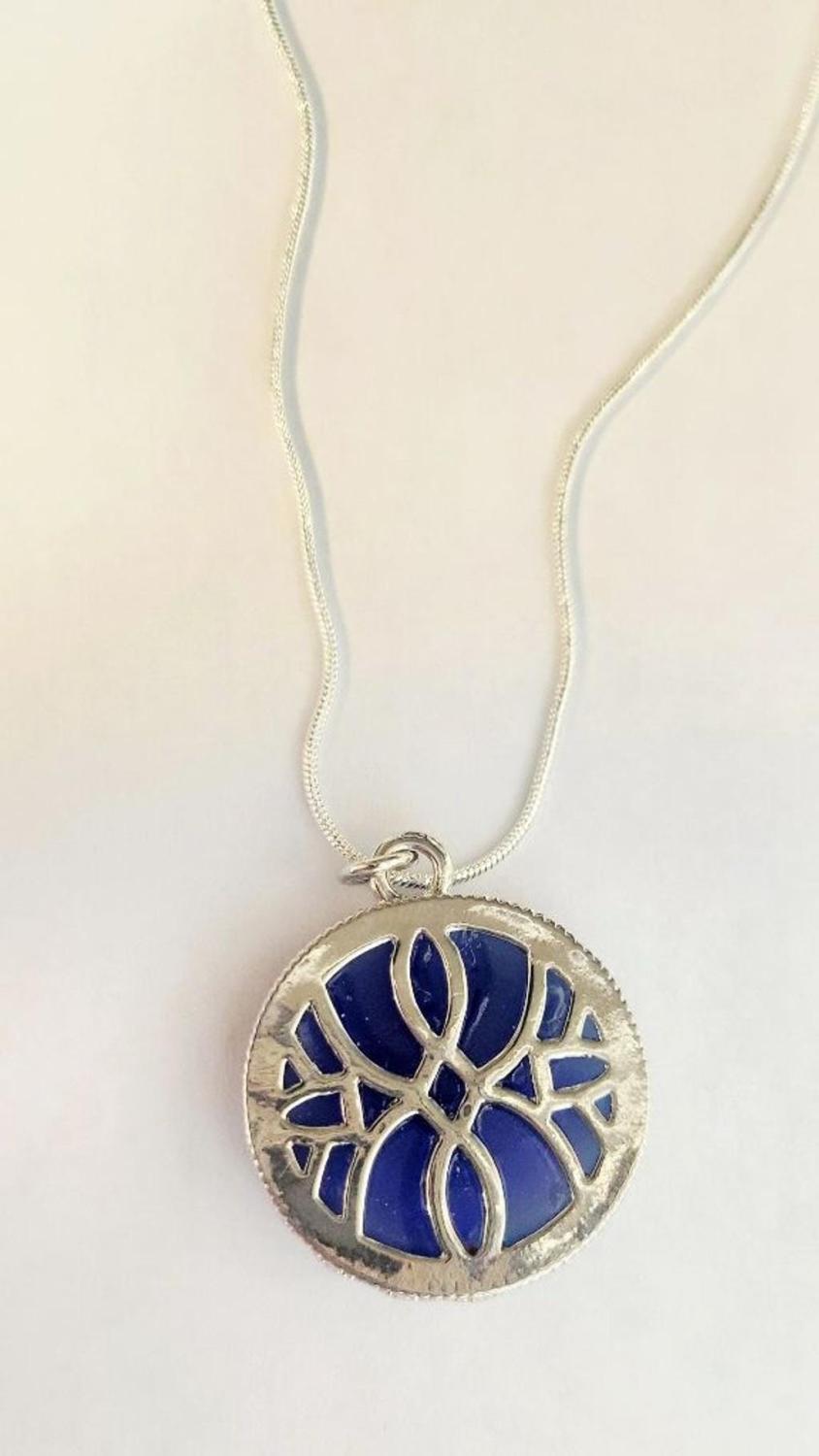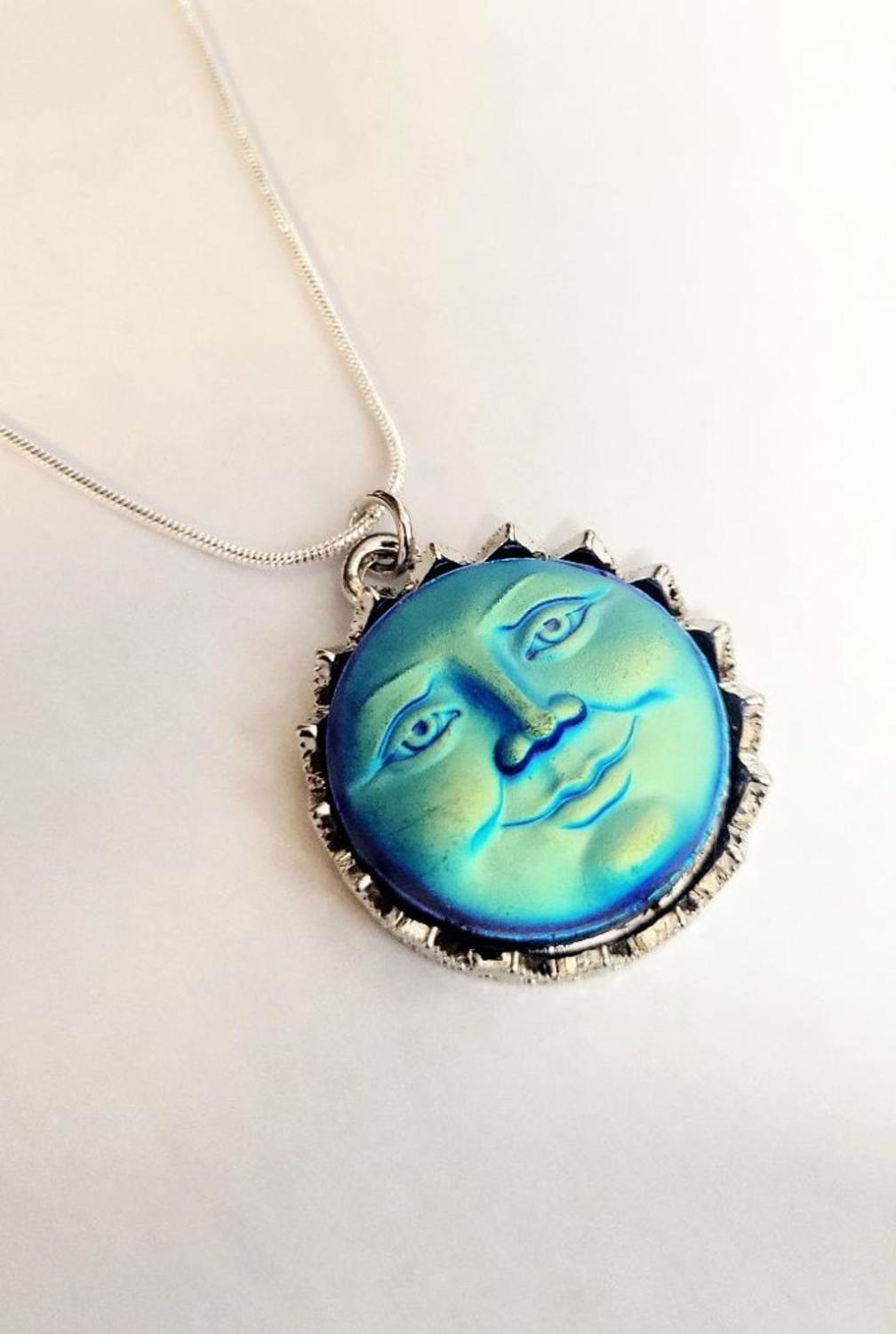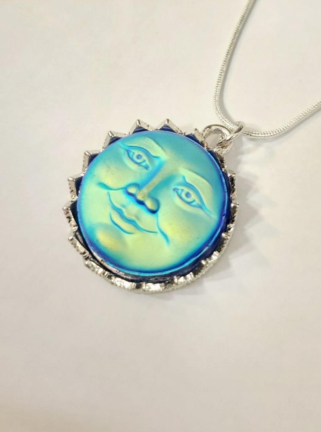 Blue pearlescent glass Moon face pendant with shades of green and purple throughout. The pendant is textured and velvety to the touch. It is backed with decorative points and is silver plated. The pendant comes with a brand new 16" stamped .925 sterling silver chain. The pendant measures approximately 1.25".