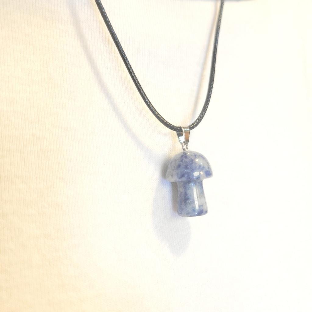 Elegant 1/2" natural blue sodalite mushroom crystal pendant on an 18" black corded adjustable necklace, perfect for adding a unique touch to any outfit.