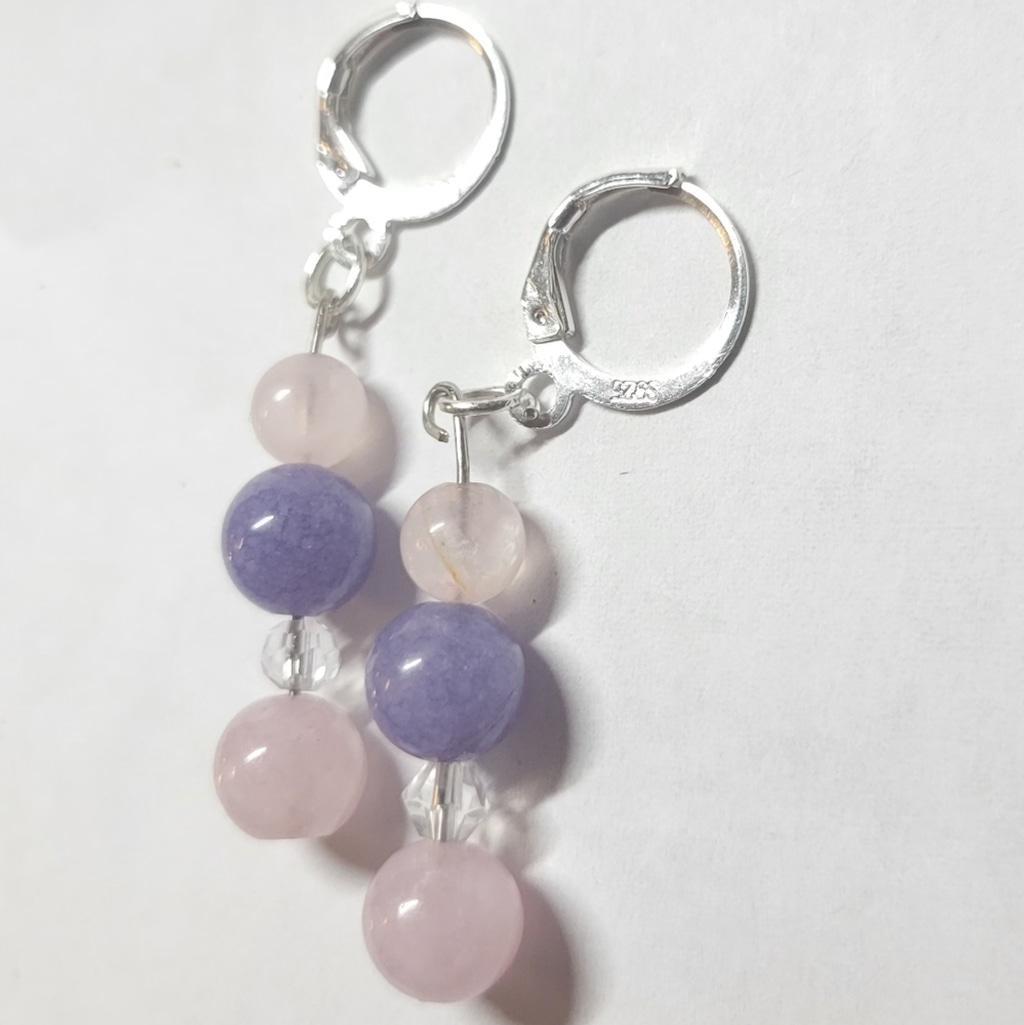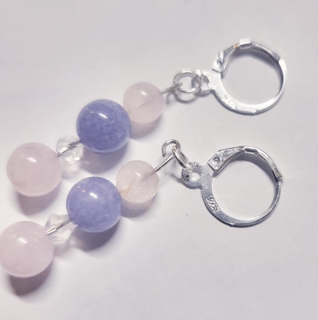 Handmade natural 2 mm Crystal Rose Quartz, 8 mm Angelite, and Morganite beaded drop earrings on a 925 stamped sterling silver lever back hook. Measures approximately 1.25".