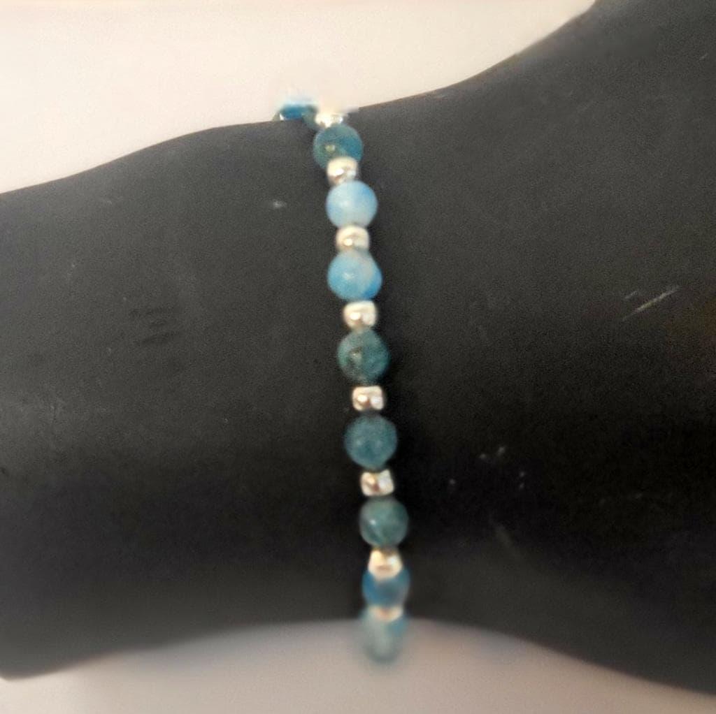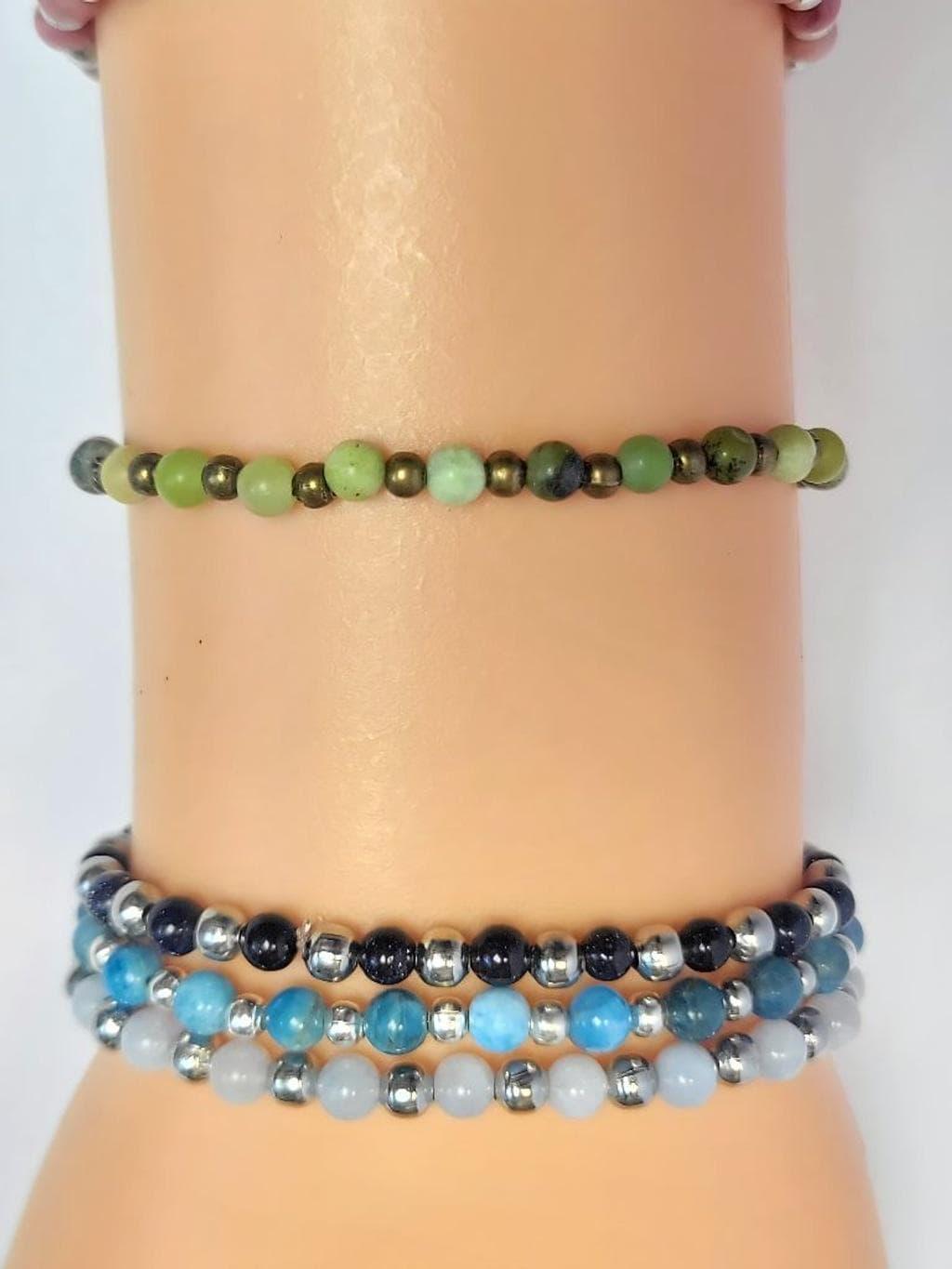 Handmade natural gemstone 4mm dainty beaded bracelets in amethyst, gray moonstone, blue apatite, Tiger's eye, Golden Obsidian, Blue Sandstone, Flourite, Aquamarine, Rhodonite, Austrian Jade, Selenite, Purple Dragon Vein, mixed gemstone. Measurements are approximately between 6.25-7". The bracelets can be bought separately, or buy 2 save $5, buy 3 save $10. Bundle to save. Amethyst protects against negative energy, stress, & bad habits. Helps with anxiety, insomnia, & headaches. Gray moonstone often called the "New Moon Stone", believed to bring about potential, perceive beyond the veil, & work with unseen realms. Blue apatite enhances communication, intuition, & motivation. Blue sandstone associated with love, hope, & commitment. Rhodonite promotes self-love & heals emotional wounds. Aquamarine courage, emotional clarity, & calm Tiger eye courage, strength, grounding Obsidian grounding, protection, energy clearing Australian jade helps emotional healing Flourite promotes mental/emotional clarity, balance, & focus