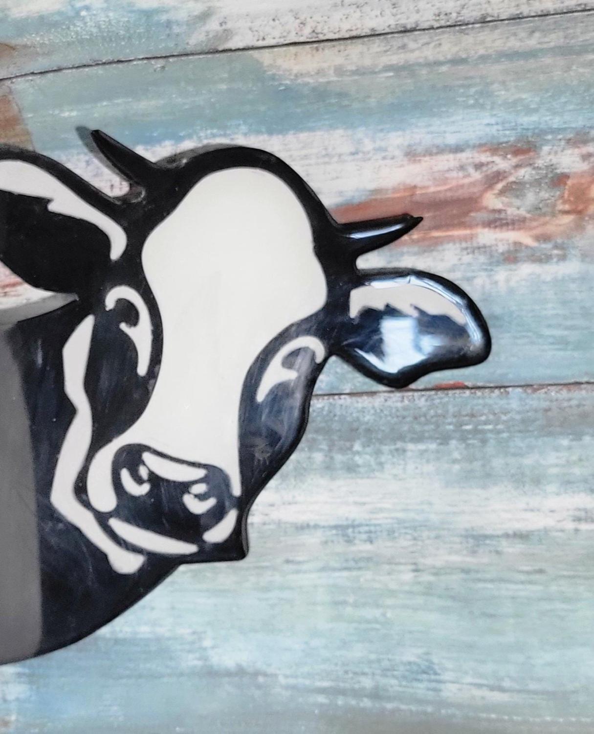 Elevate your farmhouse decor with this stunning Peek A Boo resin Farmhouse Cow wall hanging art. Handcrafted with care and attention to detail, this unique piece will add a touch of whimsy and charm to any room. Made from high-quality resin and then handpainted, the cow's lifelike features are beautifully rendered, making it a true work of art. Measurements are approximately 8" w x 9" t. There are 3 holes to hang the cow from in the neckline. There are a few see-through spots from bubbles when held up to a light. - Handcrafted with Care - High-Quality Resin Material - Lifelike Details - Charming and Whimsical Addition to Any Room #FarmhouseDecor #HandcraftedArt #ResinCowHanging #WhimsicalDecor