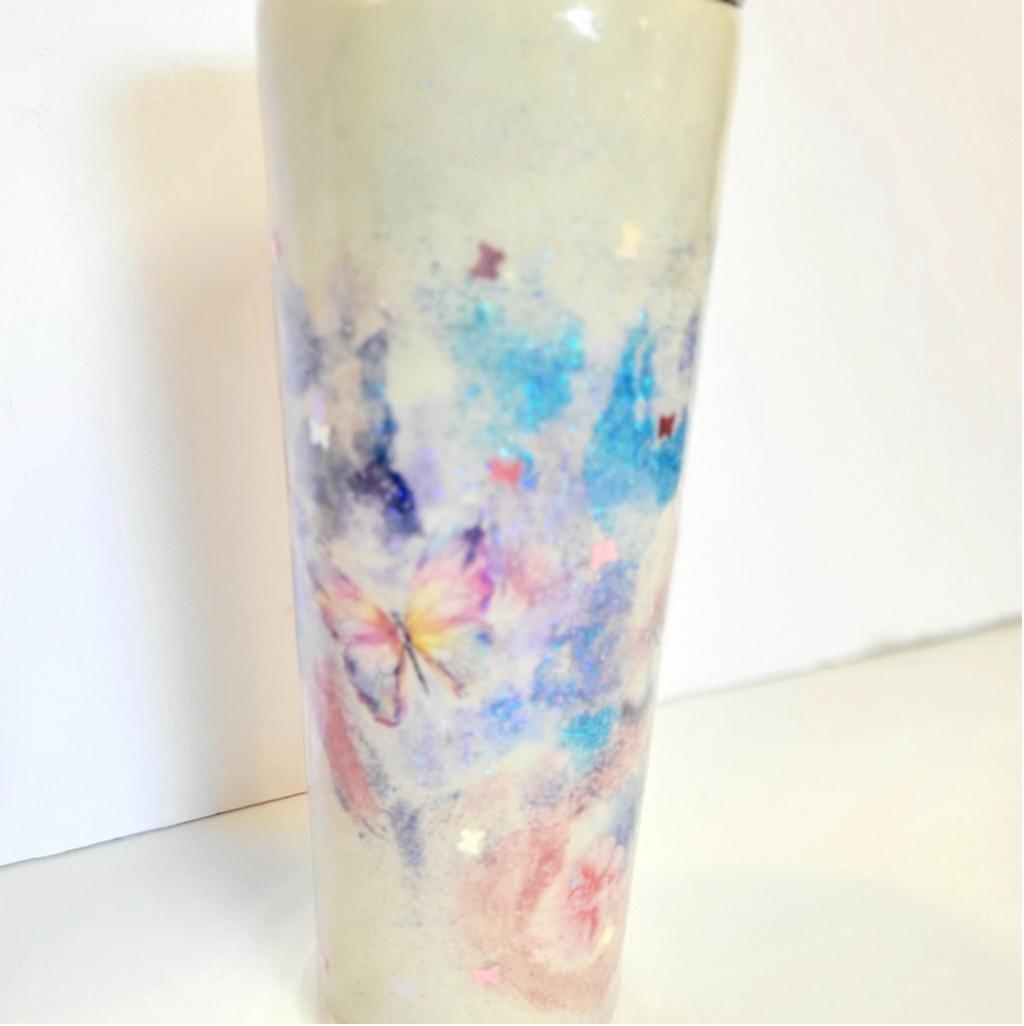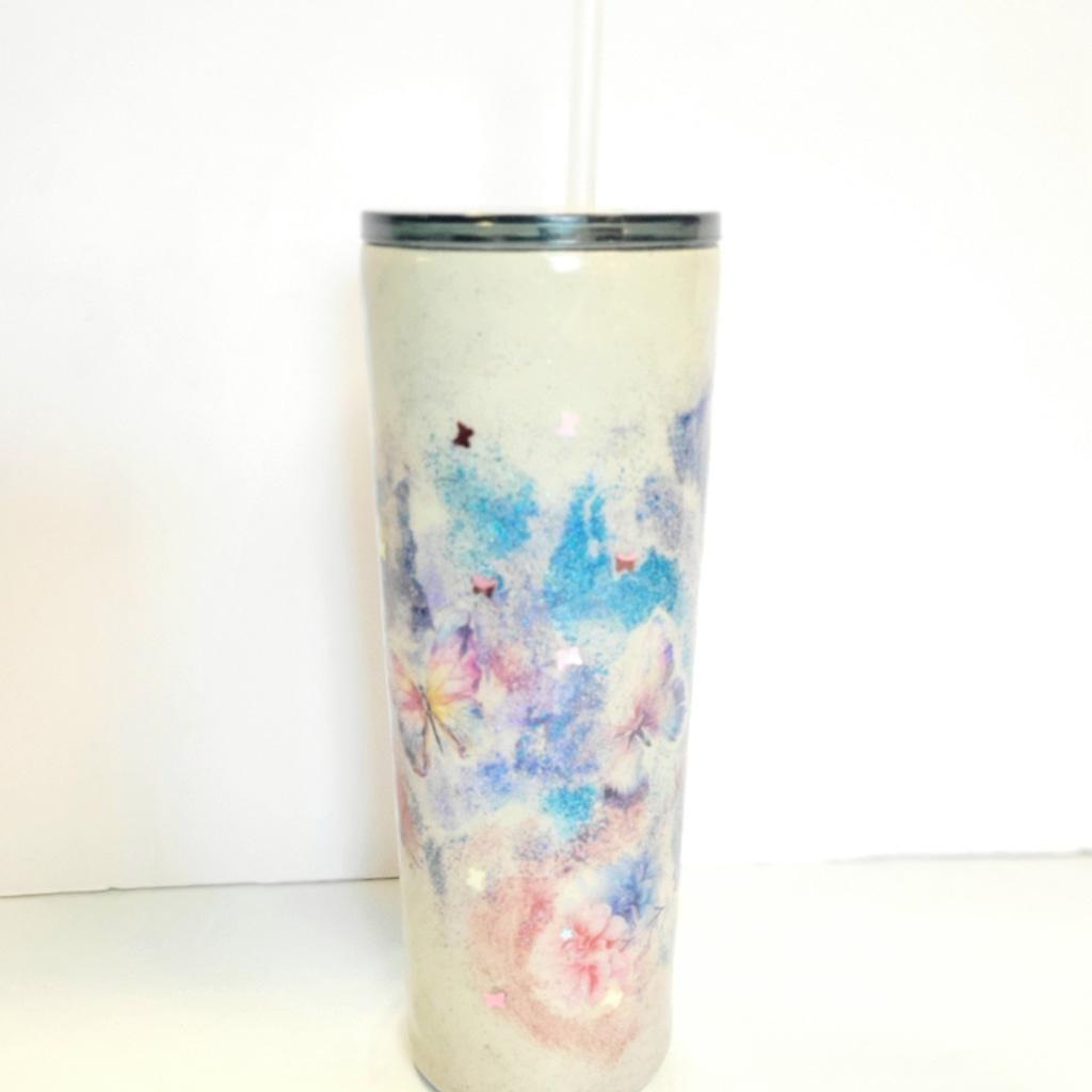 This new with tags elegant 30 oz Ozark Trail tumbler has been hand crafted with a floral and butterfly design, paint, and glitter. Features a blend of pastel colors. The tumbler stands 9" tall by 3 5" wide without the lid and atraw.