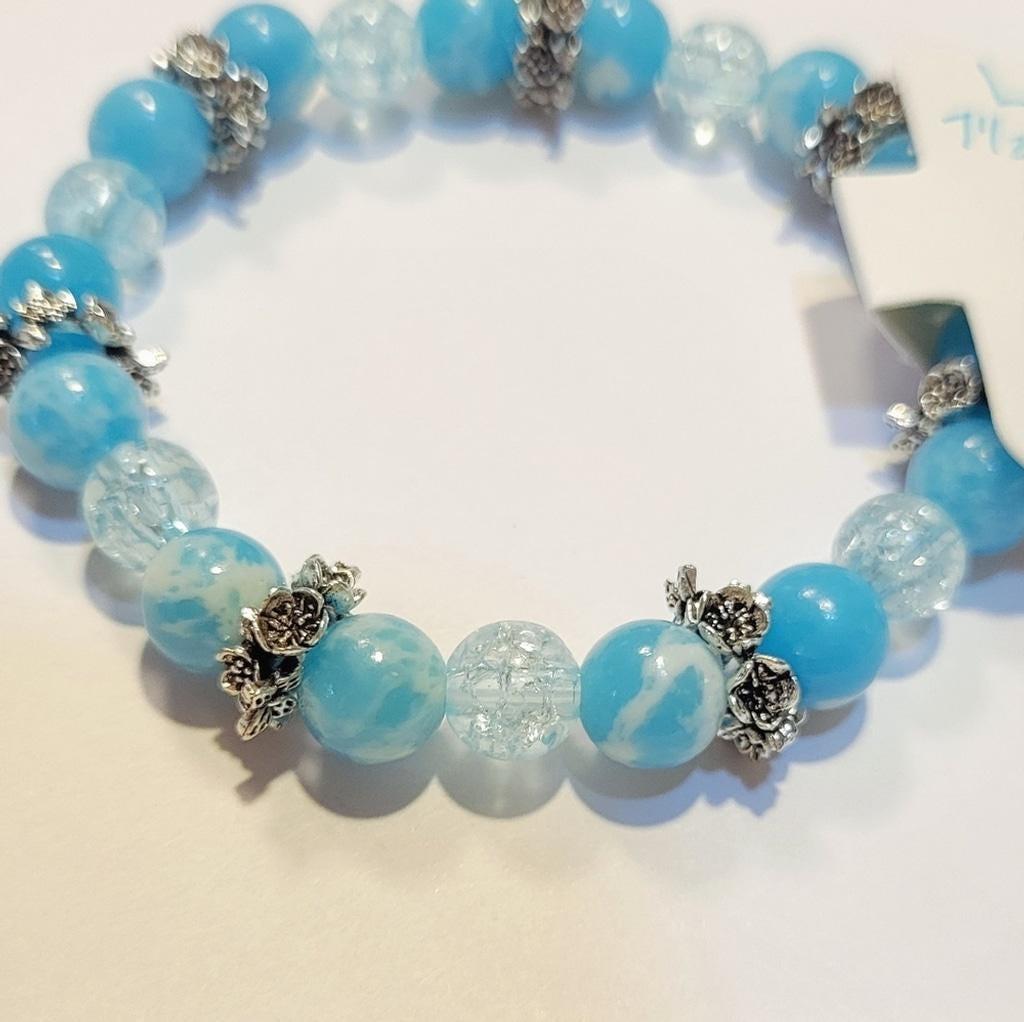 Handmade rare natural crystal Larimar 8 mm & glass beaded with flower/butterfly silver spacers bracelet on a stretchy cord. Fits a 7-7.5" wrist best. Larimar is special due to its exclusive origin in the Dominican Republic, its unique sky-and-sea aesthetic, and its perceived healing and spiritual properties linked to peace, communication, and emotional balance. The difficulty of its extraction from remote volcanic mountain locations, combined with growing global demand and cultural significance as the "gemstone of the Caribbean," also contributes to its value and mystique. Geological Rarity and Beauty Exclusive Origin: Larimar, a variety of the mineral pectolite, is found only in the mountains of Barahona in the Dominican Republic, making it geographically scarce. Unique Aesthetic: Its distinctive blue, green, and white patterns mimic the clear sky and ocean of the Caribbean, creating a beautiful and one-of-a-kind appearance for each stone. Spiritual and Healing Properties Emotional Healing: Larimar is believed to bring calm, promote inner peace, and facilitate emotional healing by reducing stress and fostering self-reflection. Throat Chakra Connection: It is associated with the throat chakra, enhancing clear communication, self-expression, and the ability to connect with one's inner voice. Symbol of the Caribbean: Larimar holds deep cultural significance, symbolizing the natural beauty and heritage of the Dominican Republic and the Caribbean.