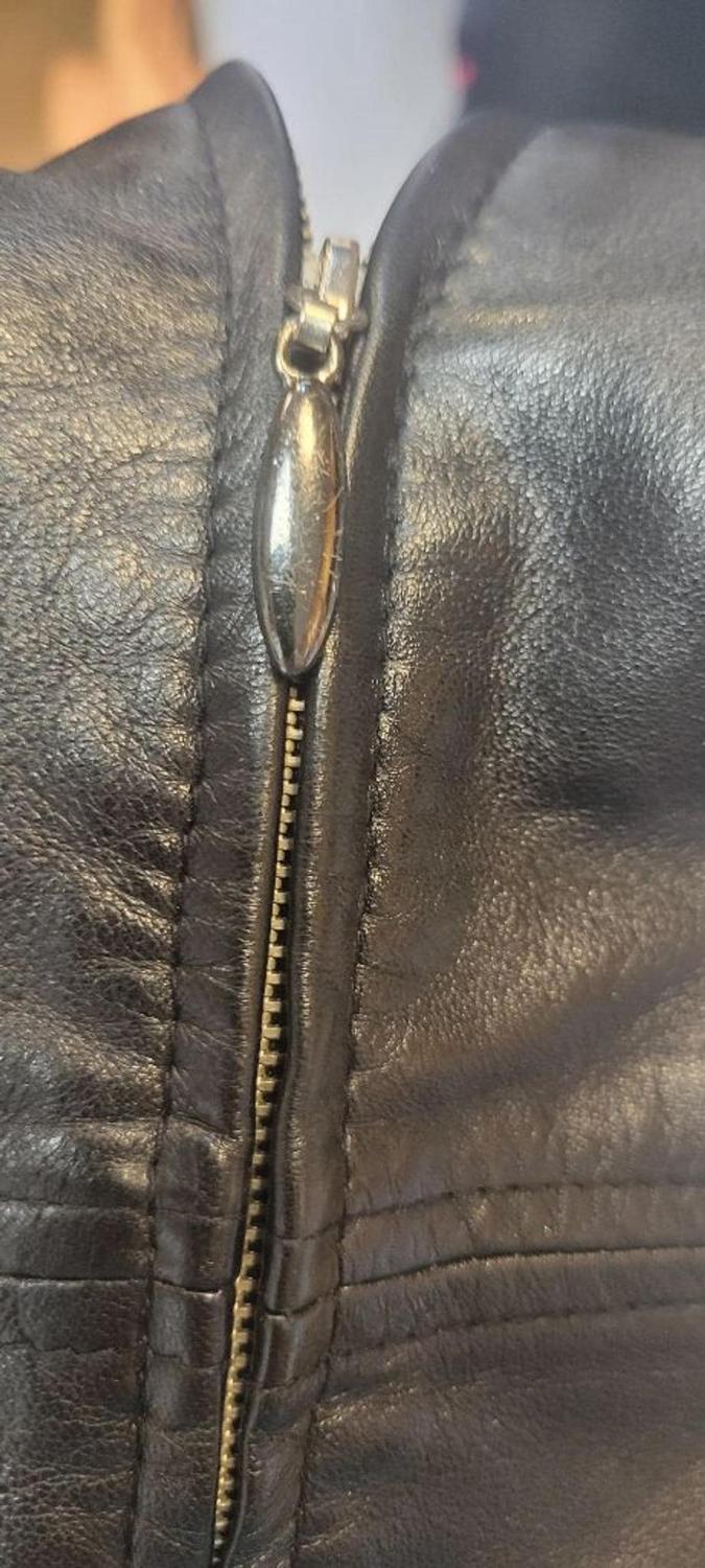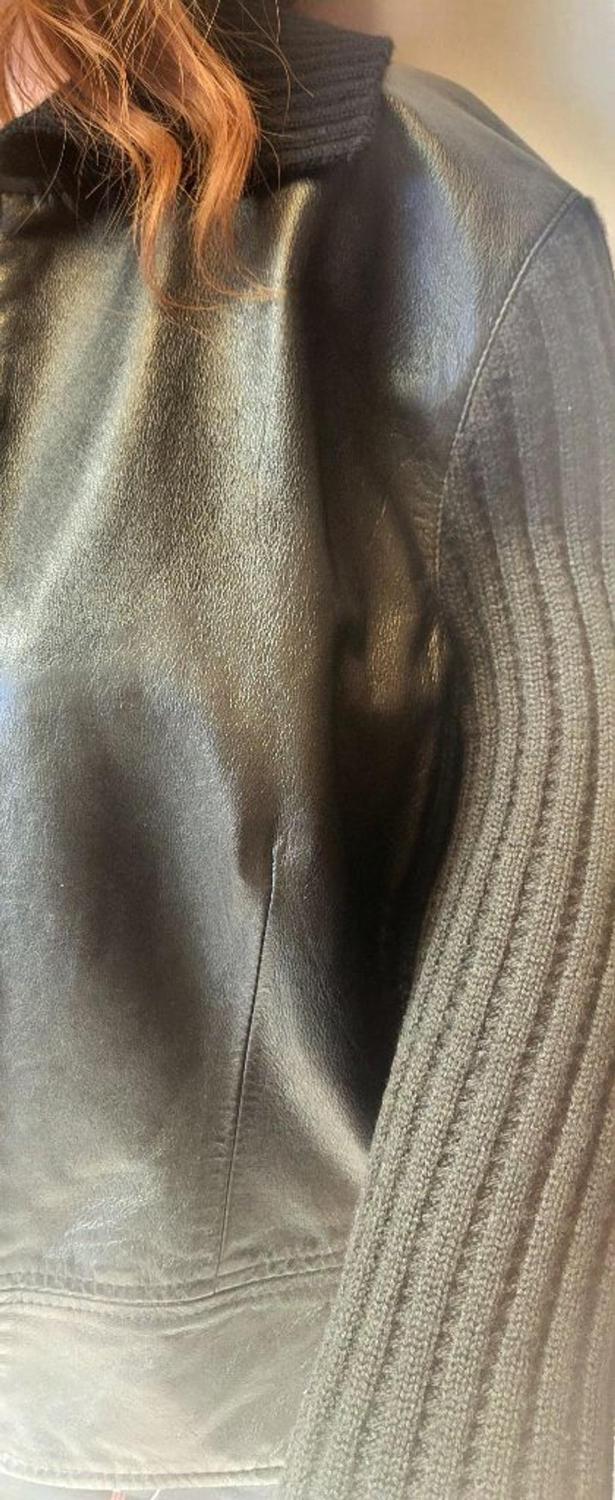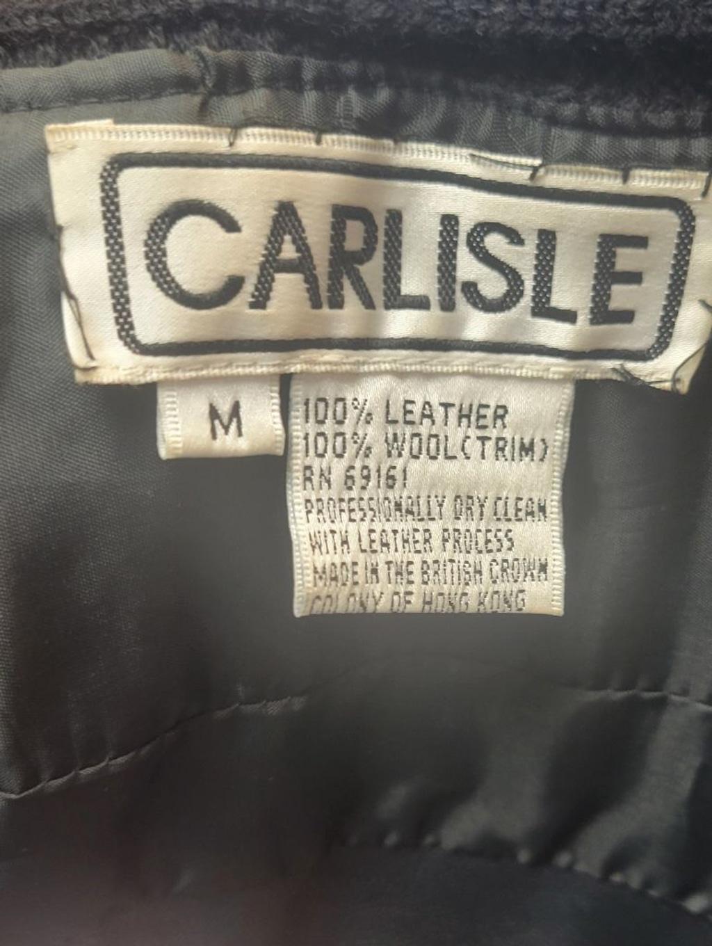 This is a stunning, hard-to-find Carlisle piece combining luxury leather with unique vintage styling. This authentic moto silhouette features high-quality materials and is presented in exceptional, truly exceptional vintage condition. ✨ Key Features: Brand: Carlisle Style: Classic Biker/Moto Jacket, Zip-Up Front Color: Deep Black Size: Medium (M) Material: 100% Genuine Leather (Shell) with 100% Ribbed Wool Sleeves and Collar (providing a comfortable, sweater-like fit). Condition: Excellent Vintage Condition. All leather is supple and soft; hardware is hardly scratched; interior lining is clean. No signs of scuffs, or discoloration. Shoulder to Shoulder: 18" Pit to Pit (Bust): 16" Sleeve Length (shoulder seam to cuff): 28" Length (collar seam to bottom hem): 18" Why Buy This Piece? A true statement piece that blends the edgy moto look with the cozy detail of ribbed wool, making it perfect for year-round wear. A high-end vintage designer item ready for a new closet!
