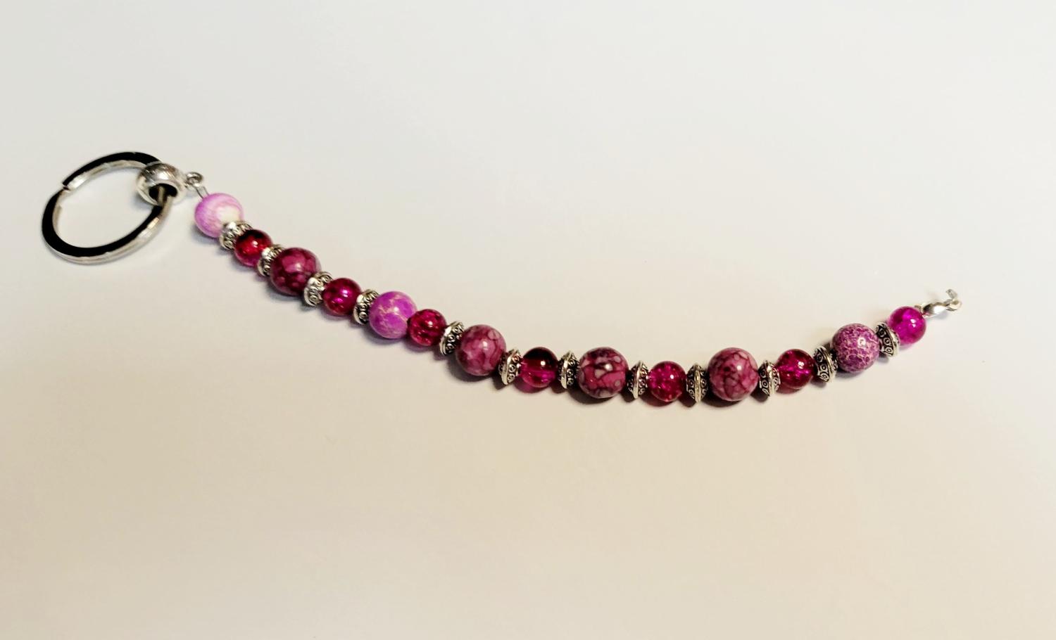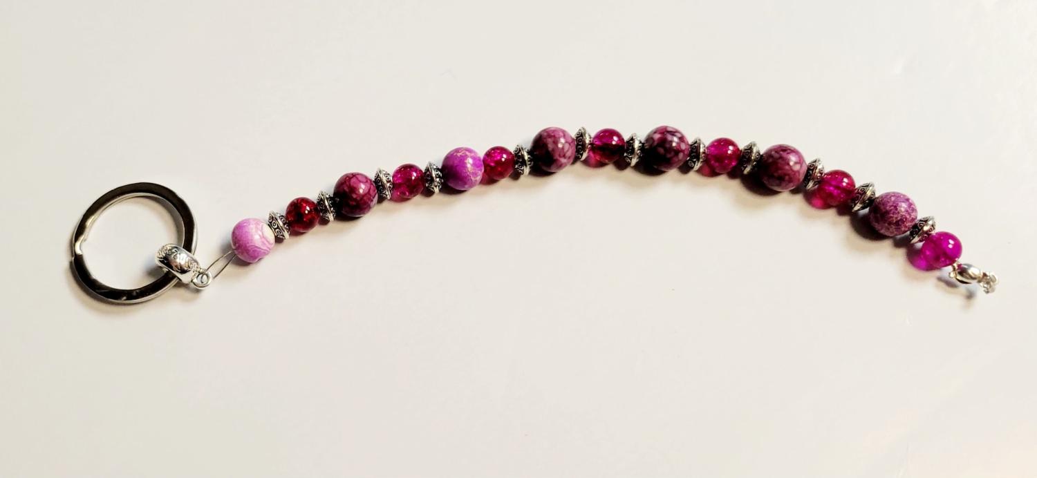 Handmade with glass beads in red and pink, with metal spacers, on a doubled steel wire, keychain. Measures approximately 6.5"