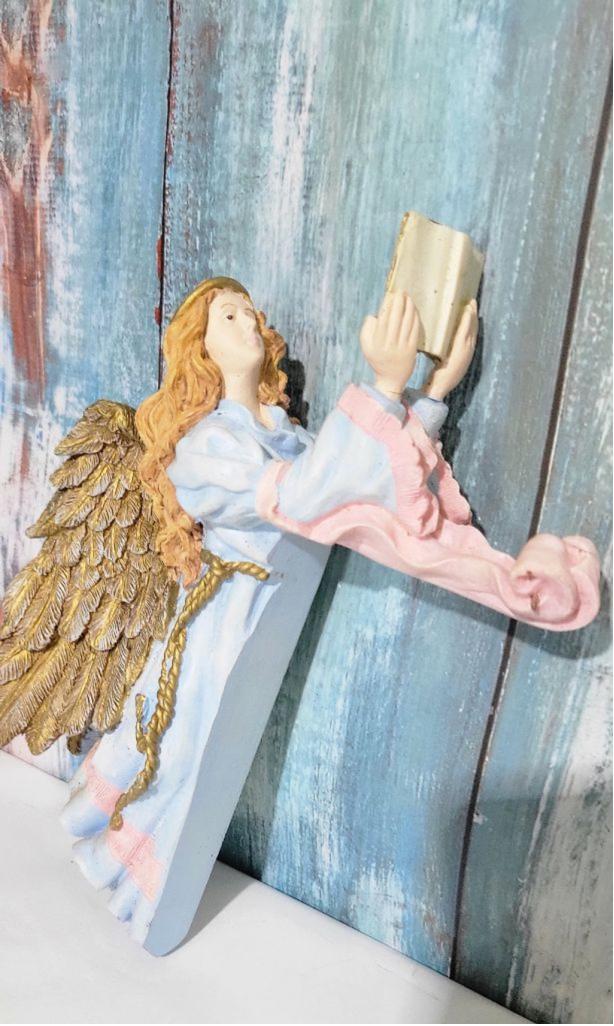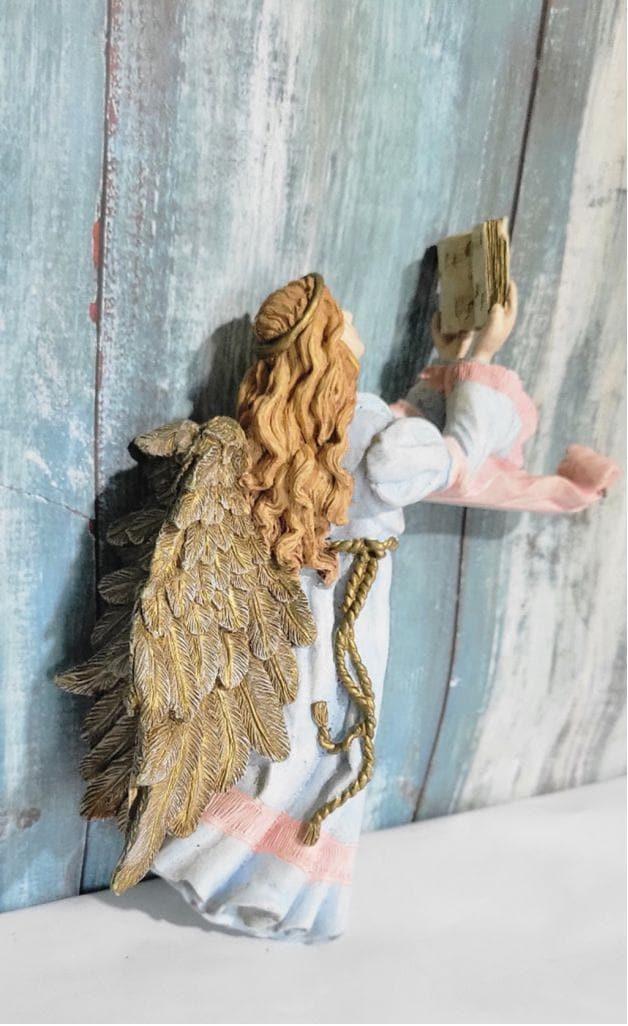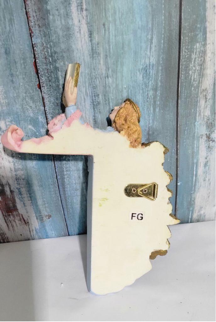 This is a pre-owned wall plaque decor featuring an Avon angel figurine plaque. The angel is depicted with long flowing hair, a blue and pink dress, and golden wings. The angel is holding a book in her right hand and has a pink scroll extending from her left hand. The figurine is made of a lightweight material, possibly resin, and is painted in a realistic style. The angel is approximately 10 inches tall and 6 inches wide. The figurine has a metal hook on the back for hanging. The figurine is in good condition with no visible cracks or chips. There is some minor wear and tear on the paint, but this is consistent with its age and use. The figurine is marked "FG" on the back. This would be a lovely addition to any home decor.