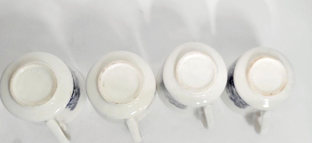 Set of four pre-owned porcelain mugs. Each mug features a blue and white landscape print. They measure approximately 4x3x3 inches. The mugs have a simple, curved handle. Minor imperfections include a small chip on one mug's lip and one handle has been repaired, and a few minor scratches on the surface. The base of each mug is marked 'Made in England'. The overall condition is good, showing signs of previous use due to its age.