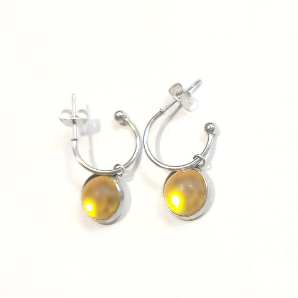 Hand crafted elegant 10 mm yellow crystal sea glass rhinestone dangle drop hoop earrings set on a stainless steel bezel tray. Perfect for adding a pop of color to any outfit.