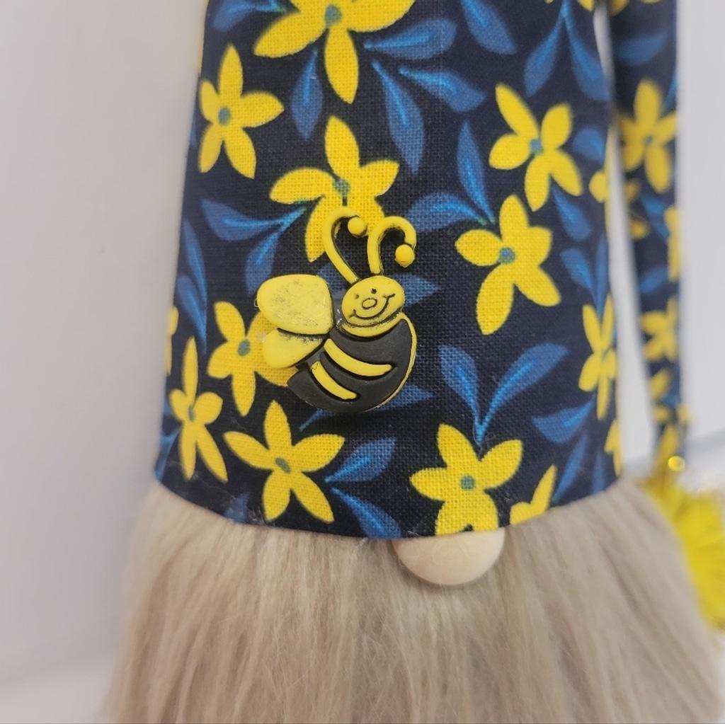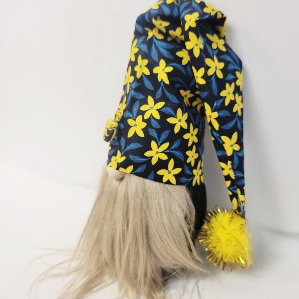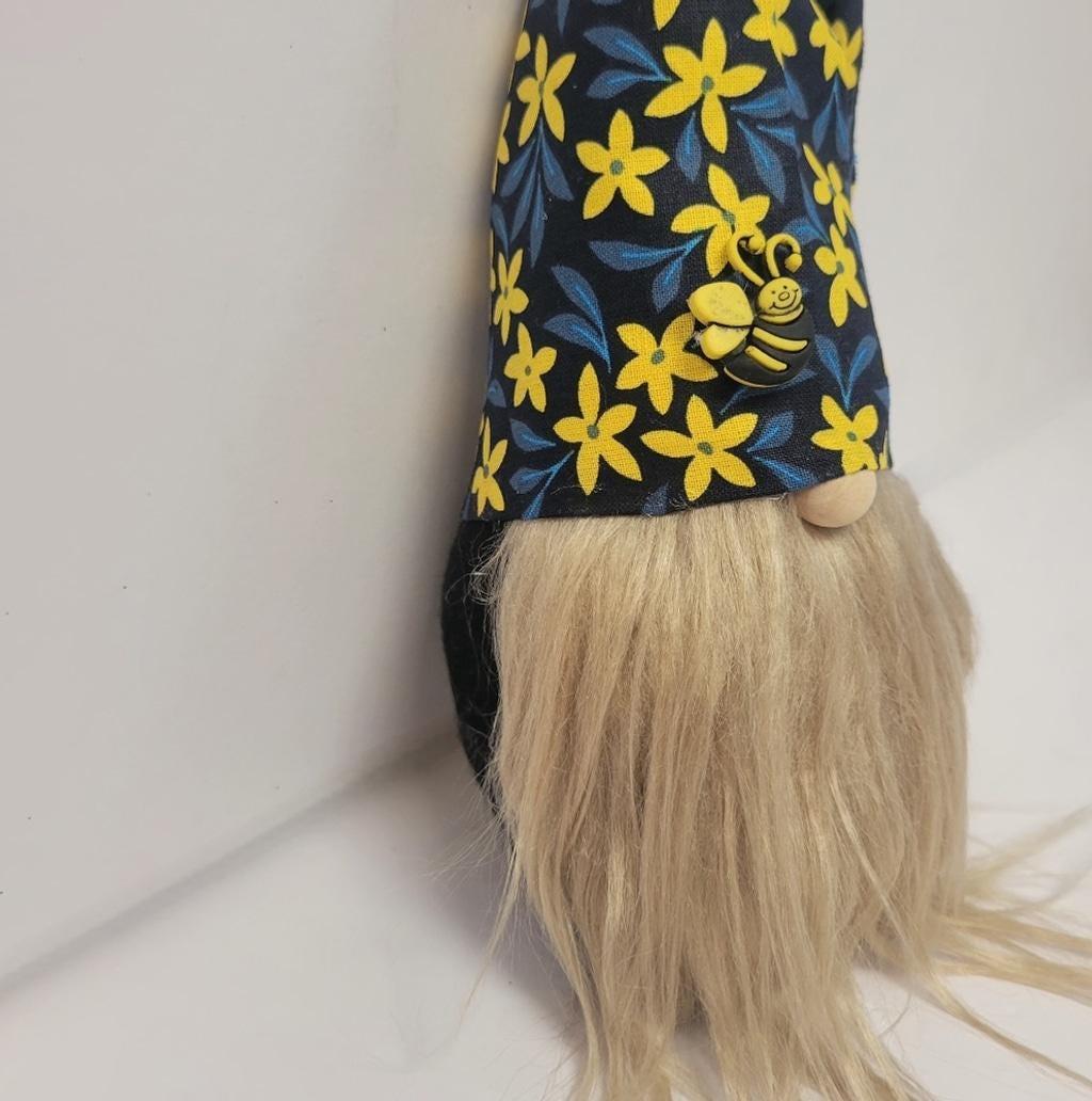 Meet Bloomfizz Daisyleaf, master gardner & flower enthusiast gnome. Bloomfizz is handcrafted with love, made from premium materials. He is weighted with rice and premium poly-fil, has a wooden nose, a long flowing blonde faux fur beard, wearing a long blue and yellow daisy printed hat, with a yellow sparkly pom pom on the tip, and a bumble bee going along for the ride. He stands approximately 8" tall and 16" to the tip of his hat. #gnomedecor #Bumblebee #daisygnome #sunflowergnome
